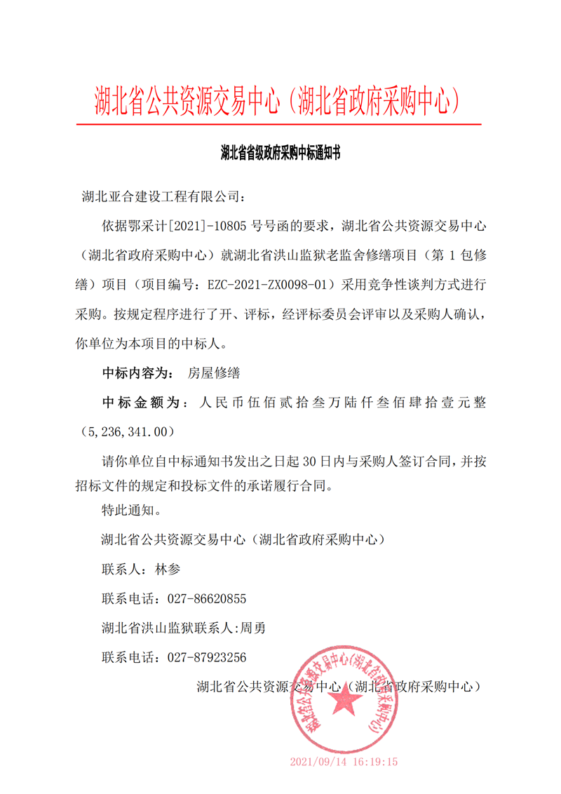 熱烈祝賀湖北亞合建設(shè)工程有限公司在《湖北省洪山監(jiān)獄老監(jiān)舍修繕項目》中標!